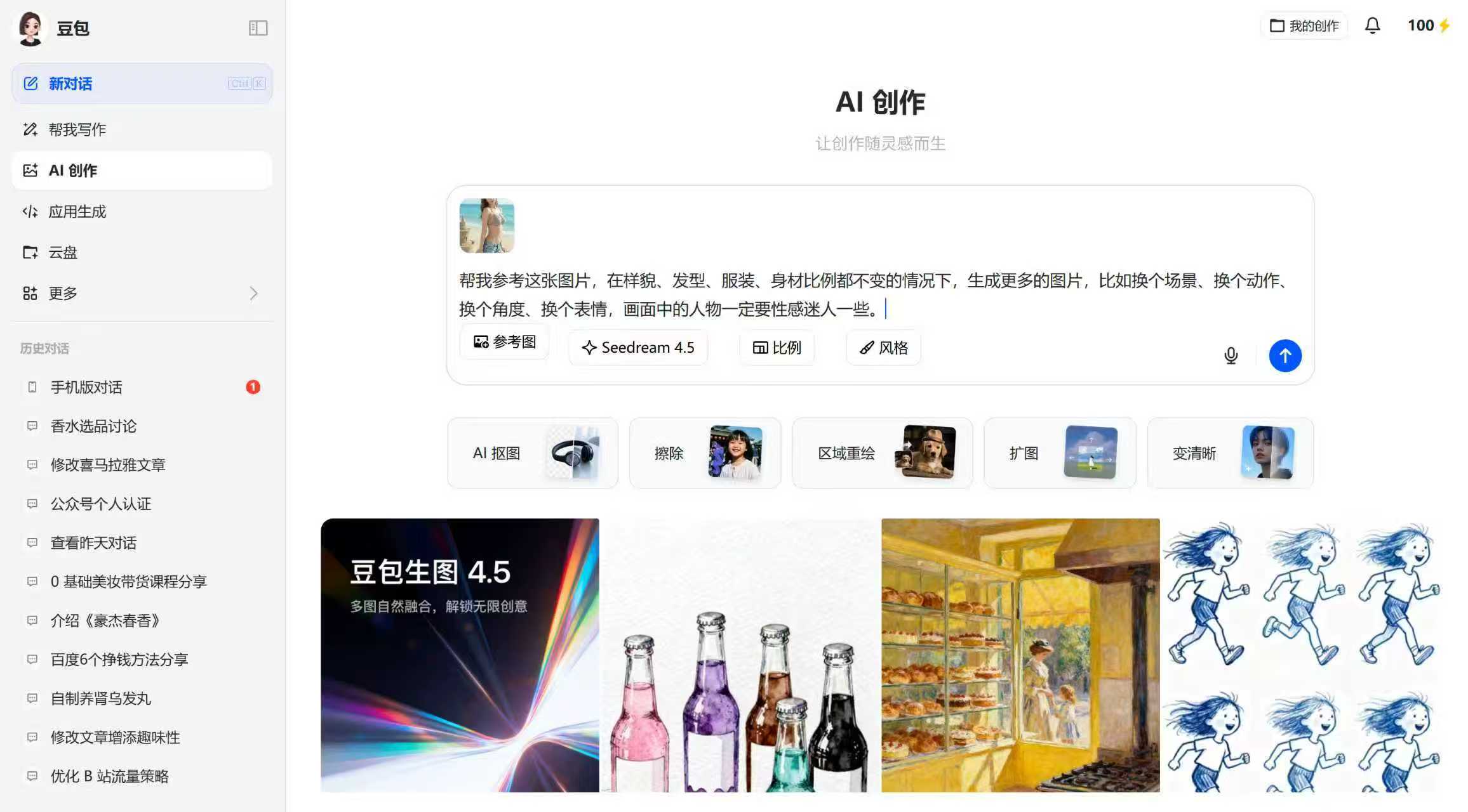 就这么往复循环,可以生成几百几千张,我们抽点时间,一次生成给几千张,够我们一个月用的了。用豆包生成的图片,会带有豆包的水印,那么去水印,工具太多了,豆包自己就带有擦除工具,把下载回来的图片再丢给豆包,使用擦除工具就可以擦掉了,或者用其他的图片编辑工具也可以。