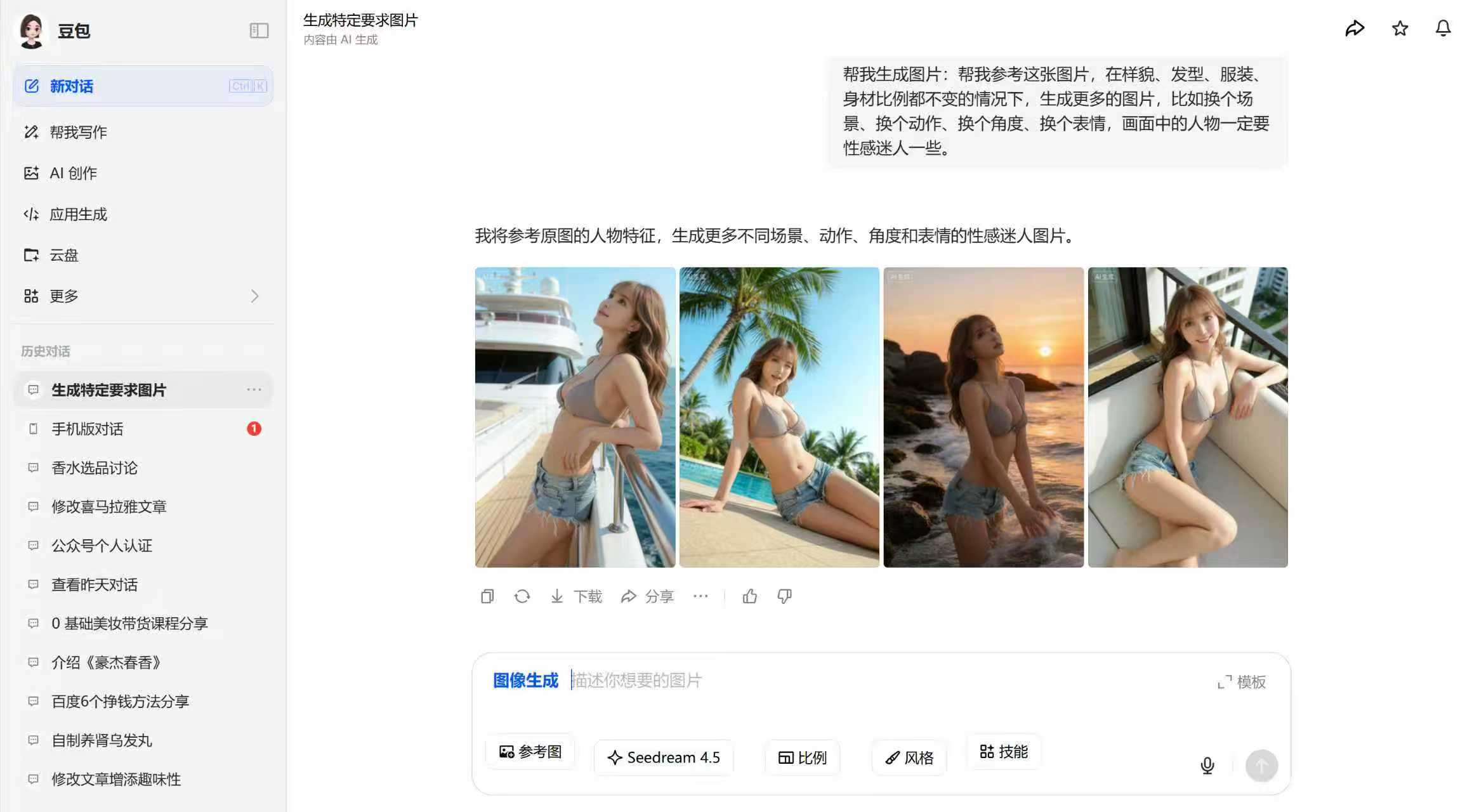 比如:帮我参考这张图片,在样貌、发型、服装、身材比例都不变的情况下,生成更多的图片,比如换个场景、换个动作、换个角度、换个表情,画面中的人物一定要性感迷人一些。