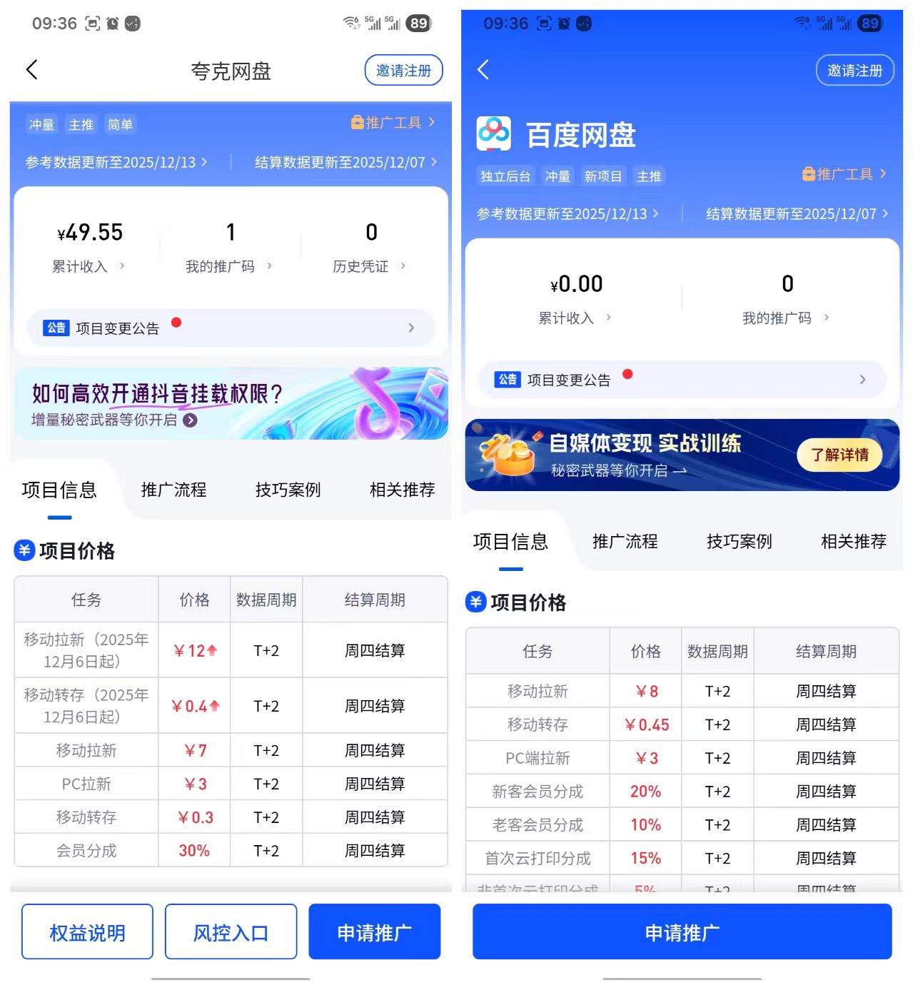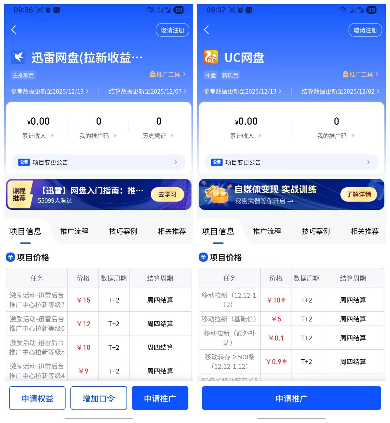 那么这种简单的方式,是靠什么盈利的呢?我们今天就来拆解一下。这种方法叫做网盘项目,或者叫网盘拉新。我们需要用到一个项目平台,个人推荐“任推帮”,用手机号注册就可以,应用商店没有的,可以去他们官方的公众号,一样可以操作。然后,我们需要去申请一下要做的拉新项目,比如:夸克网盘、百度网盘、UC网盘、迅雷网盘等等。