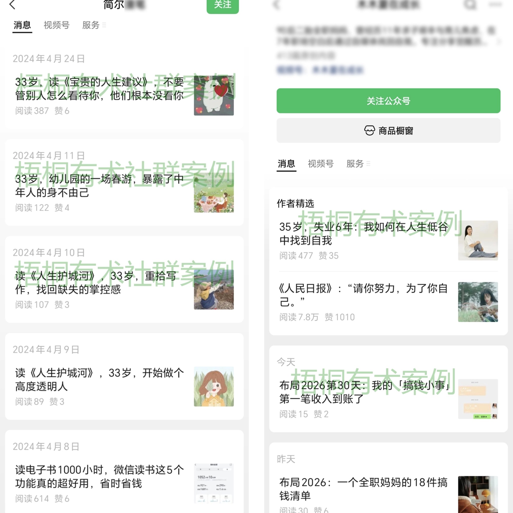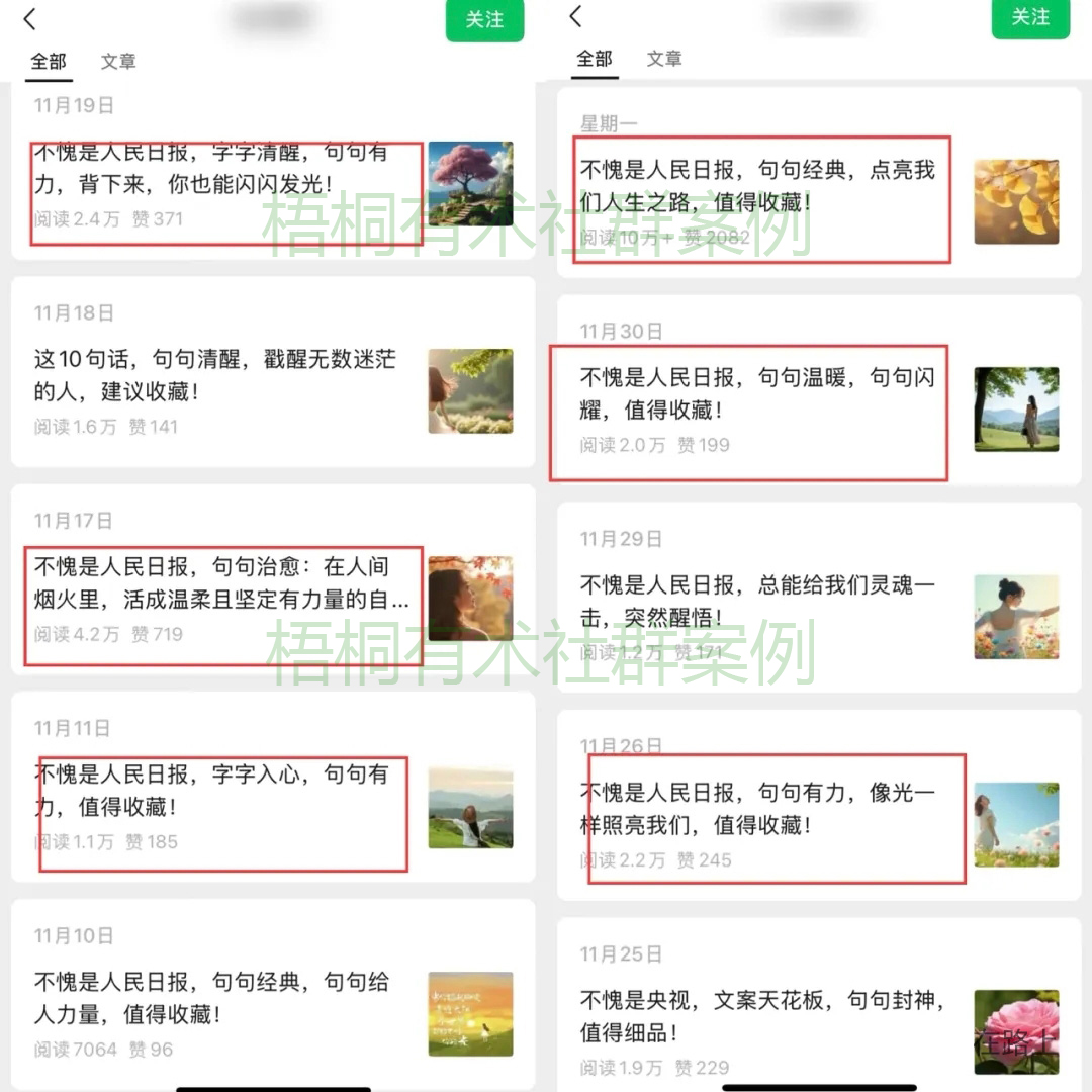 社群之前分享过女性成长赛道的公众号的写作方法,因为社群里用到了一个对标账号,结果很多小伙伴都盯着这个对标账号的方式去写,写来写去,流量越写越少,包括这个对标,自己的账号流量也不是太爆。有的小伙伴就换了别的赛道,有的小伙伴就用了我们在其他课程中用到的方法,也就是借助一下其他的平台,直接把流量拉爆了。类似于我们之前分享名人名言的做法。我们来看一下案例: