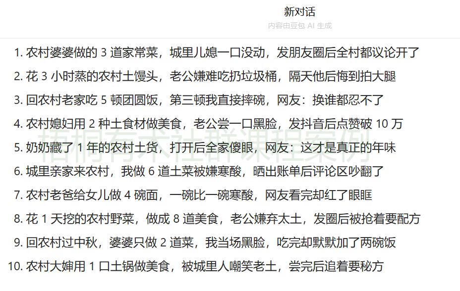 我们可以把里面的流量比较大的标题,提取出来,然后投喂给豆包,让豆包对这类标题进行仿写,一次生成够你一个月用的标题: