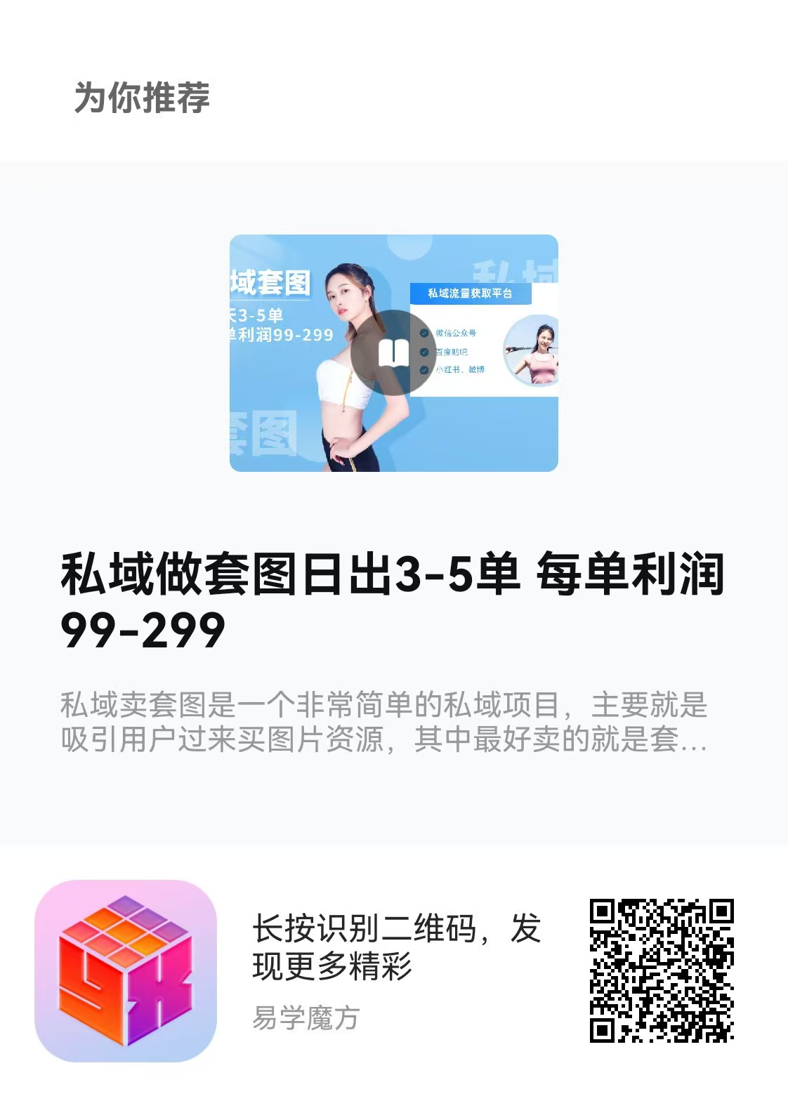 当然,小绿书买套图,是因为当前发布小绿书,几乎没有了流量主收益,通过发布图片引流到私域来买套图。小绿书只是引流的一个方法,还有很多平台可以引流,比如小红书、qq频道、百度贴吧、知乎、B站、百度文库等等,很多详细内容在视频课程里会有完整的介绍,如果需要视频课程,可以添加微信:eps5995支付48元获得网盘版教程,也可以扫描下方二维码,在易学魔方app内支付后在线学习。同时,通过本人加入梧桐有术社群的,或者购买魔方会员的,免费赠送一年套图站会员。