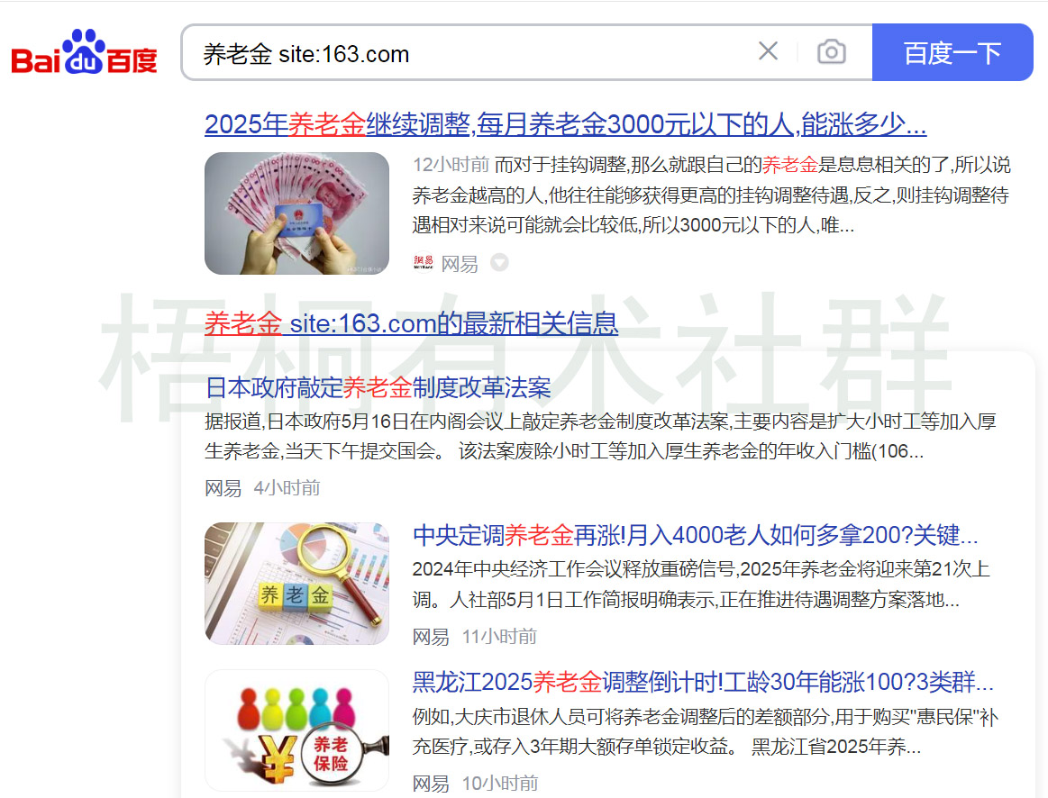 3.用我们万能的百度去搜索,老的互联网人斗志到怎么搜,那么这个方法就教给不会百度搜索的新手小伙伴们。就是用百度 site命令的方法,这个方法不仅仅可以搜“养老金”,将来写什么都可以用这种方法去百度搜索全网的文章(具体咋弄视频教程里有细说)。哪个标题看得你有想点进去看的想法,咱就可以拿哪个当范本。