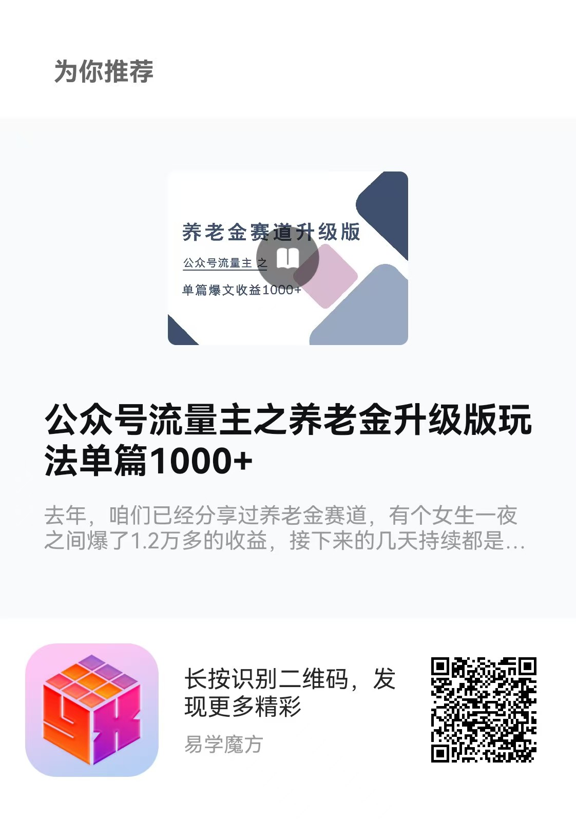 各位小伙伴们!今天咱要分享的的课程是:公众号流量主之养老金赛道玩法,爆一篇直接赚 1000+!去年咱们就分享过养老金赛道玩法,当时有个女生直接爆了 1.2 万收益,后面几天每天也有几千块进账,单篇文章总共赚了两万多 。这已经相当于很多小伙伴打工小半年的工资了,这个战绩在咱们社群里也算是非常不错的了!