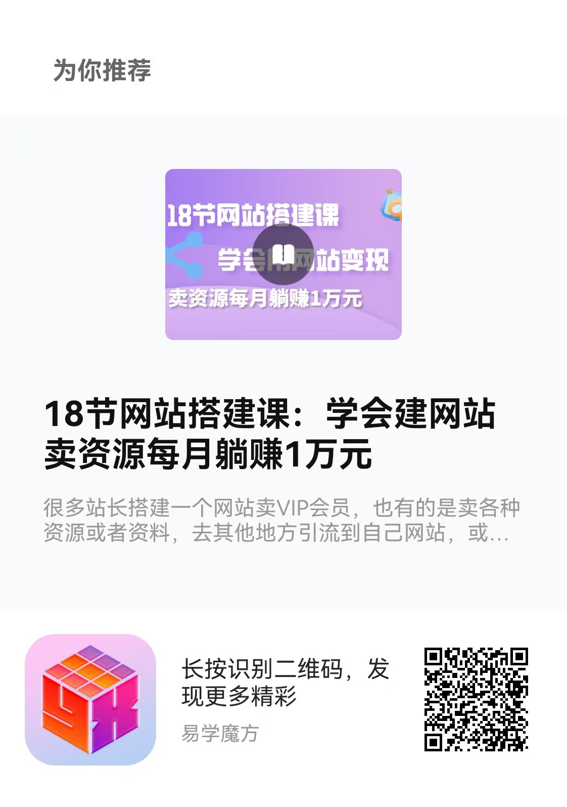 当然,没有网站,我们用私域的方法一样卖!网站能够自动成交,而且抵御平台规则变化的能力要很多。不会搭建网站的,不要去网上找人搭建,很多人会给你留后门、挂马。我有一些小伙伴就中招了。可以自己去学习搭建,这样才是最踏实的,或者你可以去易学魔方,上面有18节的网站搭建课程,你也可以扫描下方二维码决定是否学习!当通过自己的双手把网站搭建起来的时候,你会有一种油然而生的成就感,何况网站还能给你赚钱?