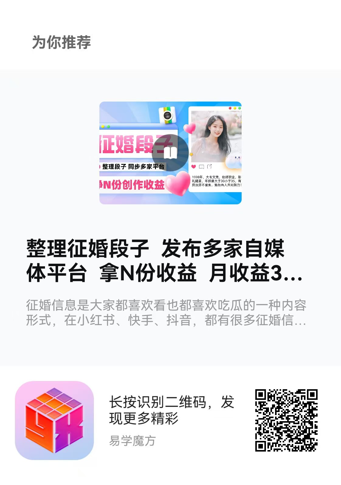 学习更多优质副业课程,请到手机应用商店下载易学魔方app,注册时填写激活码:5995。作者微信:eps5995,添加好友可以领取3套亲测靠谱的项目课程!