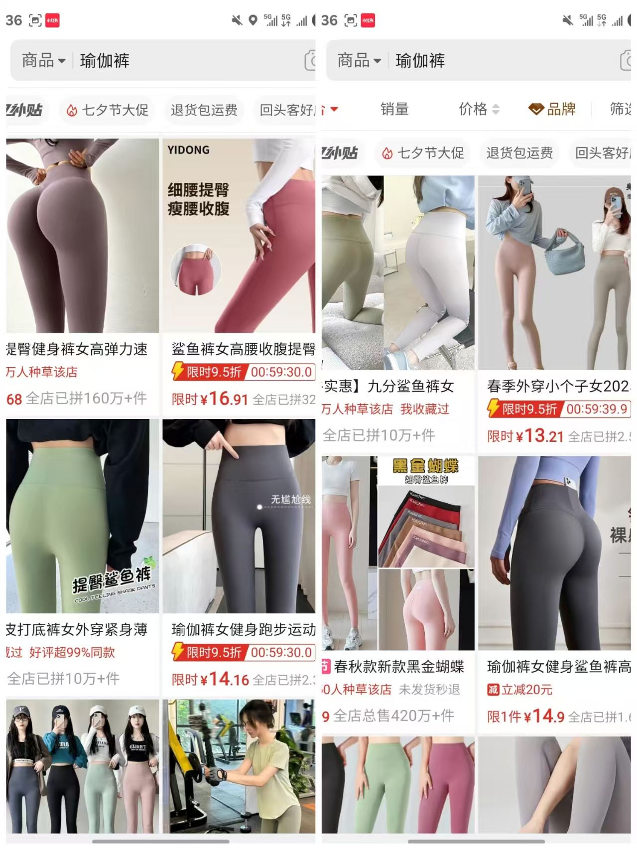 好了咱进入正题,既然丝袜不能卖了,总得有替代品吧?答案就是瑜伽裤!先去拼多多搜搜,一条瑜伽裤才几块到十几块,成本低到离谱。肯定有人会问:“这么便宜的质量,万一人家觉得不好要退货怎么办?”