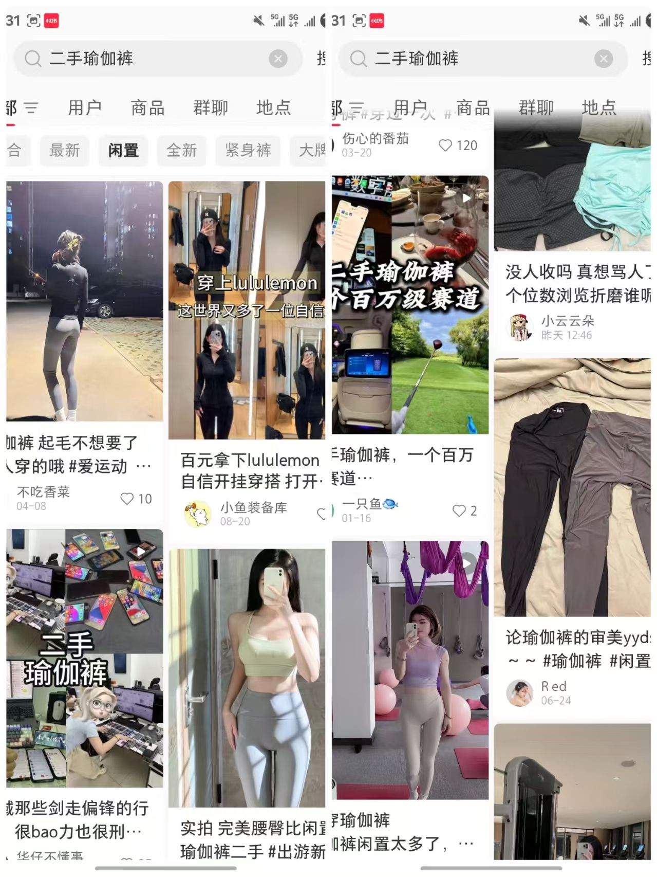 再说说小红书的玩法,先搜关键词,比如 “闲置瑜伽裤”“出瑜伽裤”,就能找到很多同行,看看人家怎么发的。你会发现,随便一条闲置瑜伽裤的笔记,都有几十上百个咨询,要是多搞几个号矩阵操作,那流量简直了,赚翻不是问题。