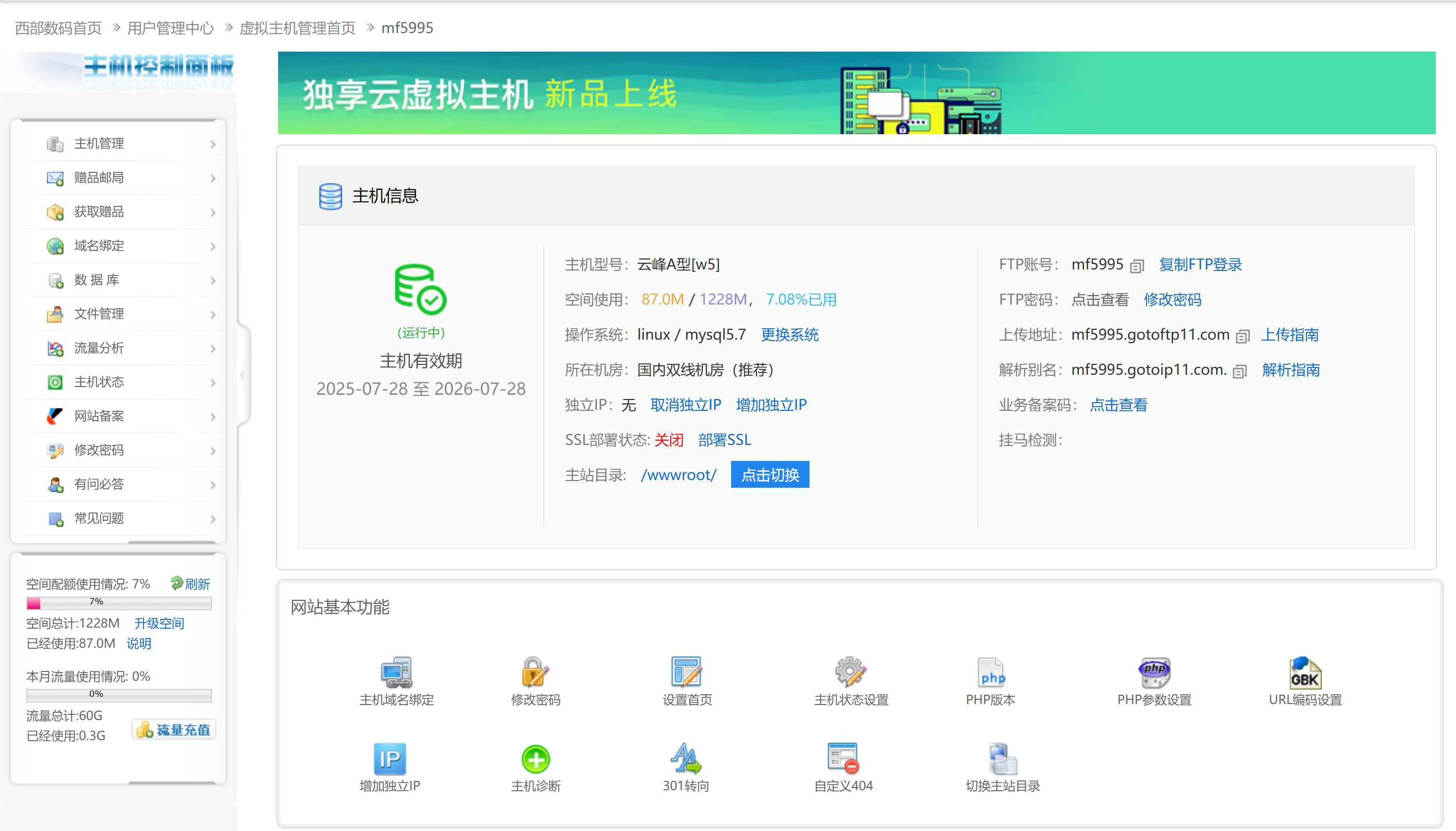 可以看到,虚拟主机的整个文件非常非常小,只有1个G大小,已经使用了87M,仅7%而已。