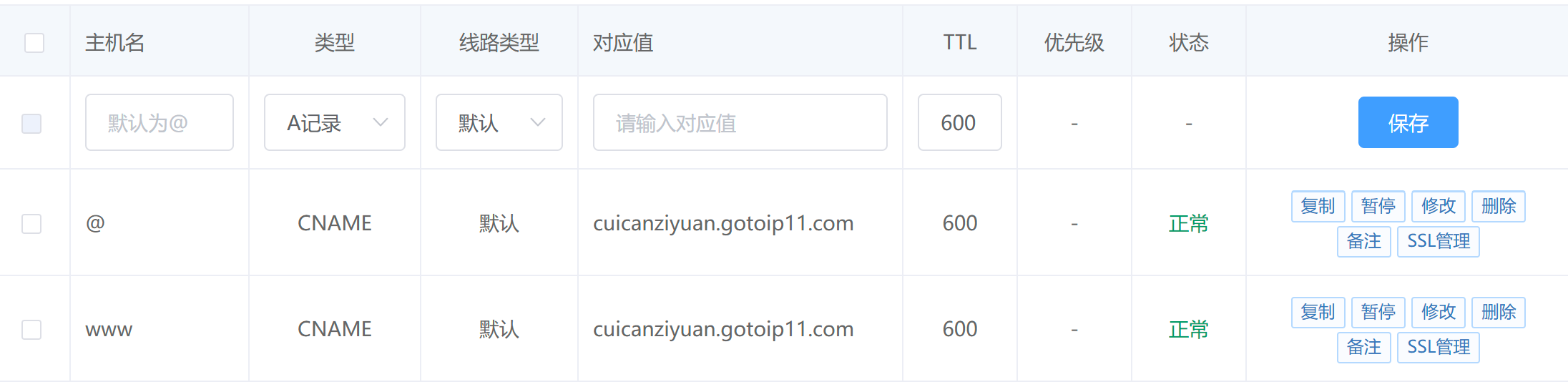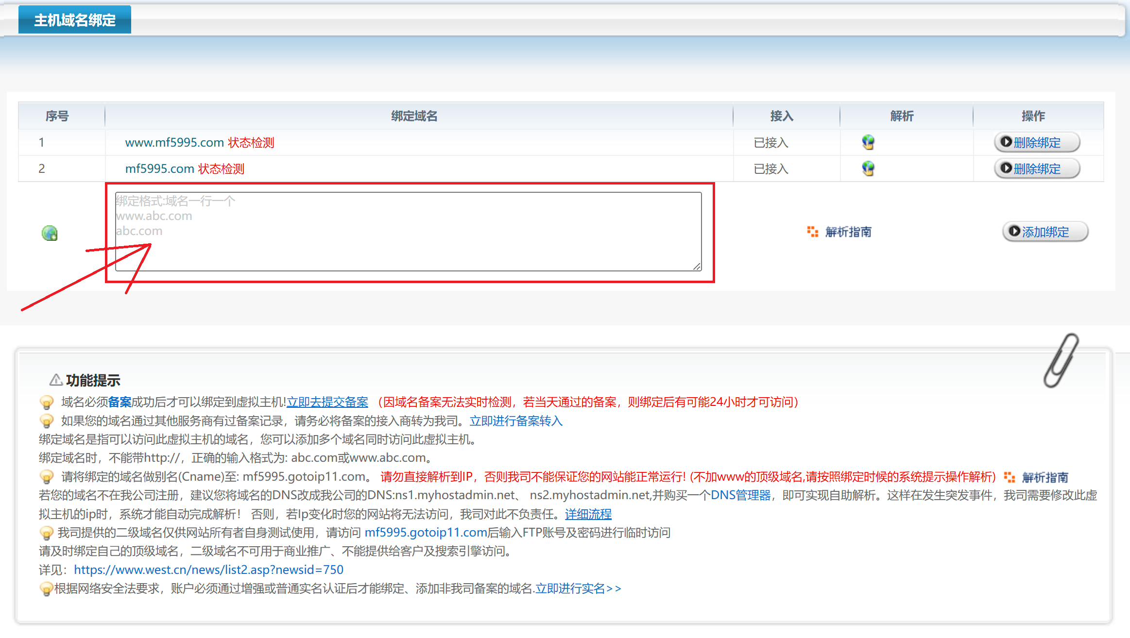 在主机名的位置,我们要将@和www都进行解析,类型选择CNAME,其他的无需你操作,点击解析即可。然后,我们点开虚机管理,找到你的虚拟主机,在主机域名绑定中,将你解析的两个域名填入方框,点击添加绑定即可。