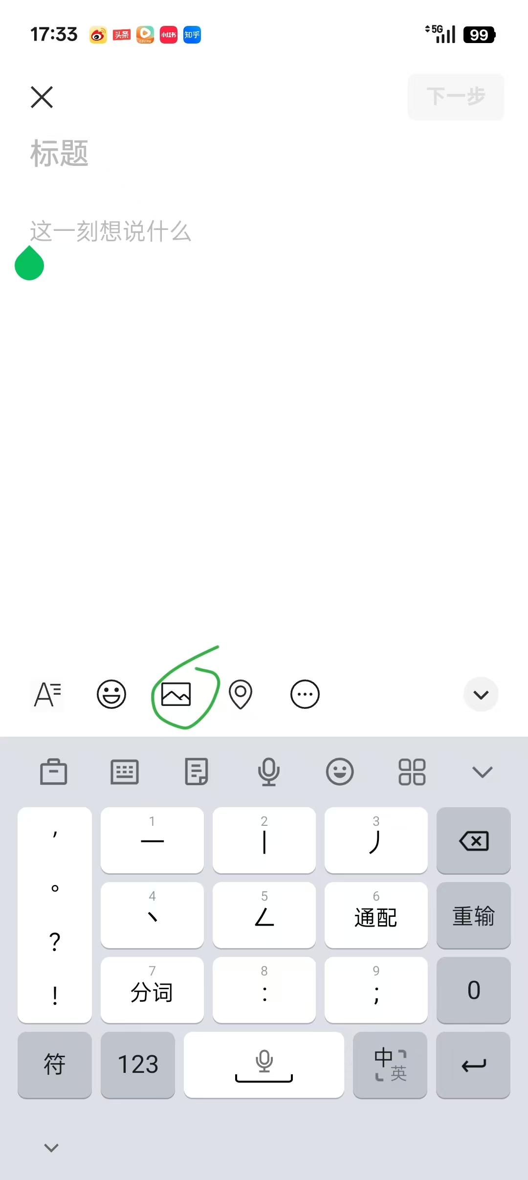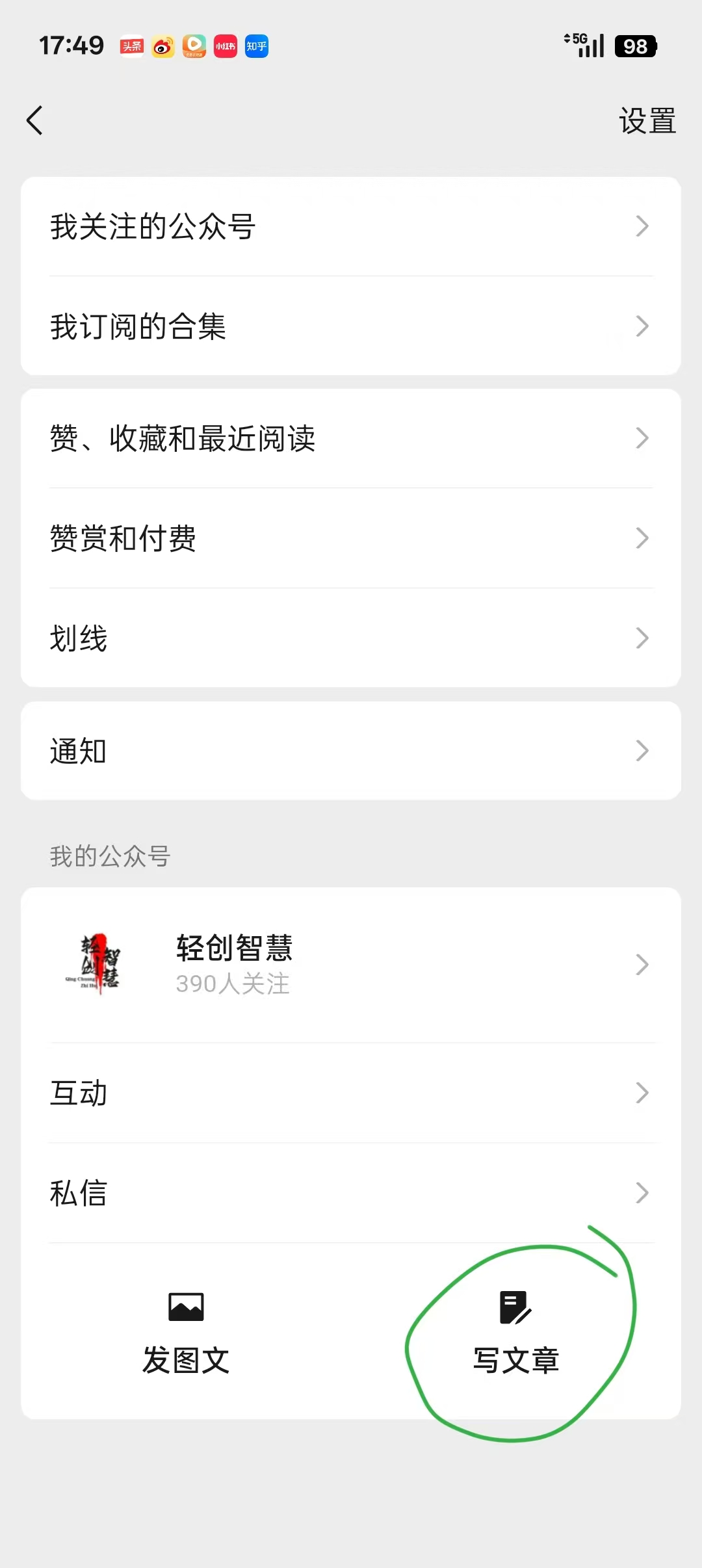 在右下角有发图文和写文章两个选项,我们虽然发的是图片,但是发图文,也就是人们说的小绿书,目前没有流量主收益了,所以我们以文章的形式做这个赛道也是一样的。点击下图圈里的图标就可选择你手机的图片了。