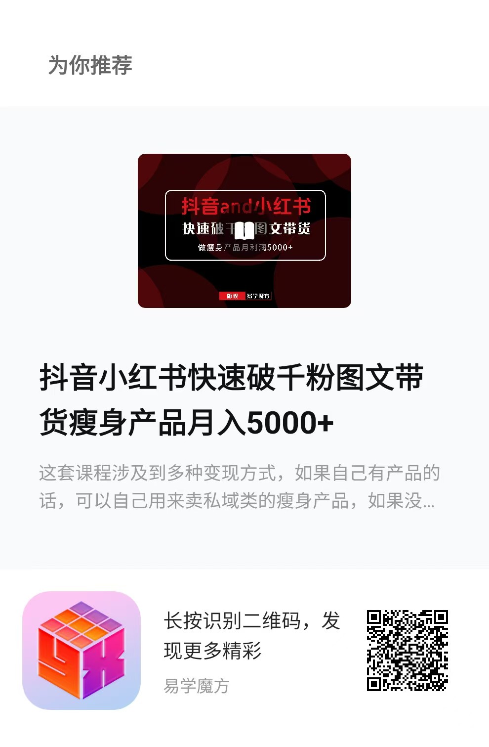 各位小伙伴们大家好!今天给大家分享的这个课程,真的是到了小白闭眼入的程度,教你怎么在抖音、小红书快速搞到 1000 粉,用图文带瘦身产品每个月整个 5000+,关键是一分钱不用花,流量还巨大!